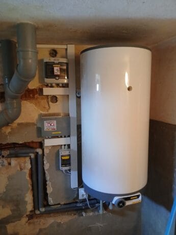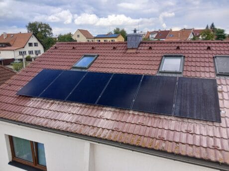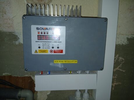 Instalace 6ks panelů AIKO 450Wp a MPPT regulátoru SolarEco. Ten zajišťuje ohřev nového bojleru Dražice OKCE 125 2/2kW a stávajícího bojleru o objemu 80l. Projekt realizován s podporou NZÚ 2023+.