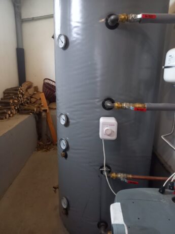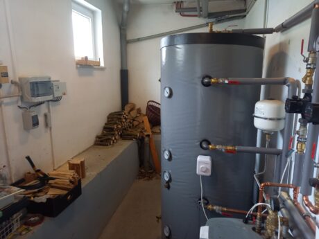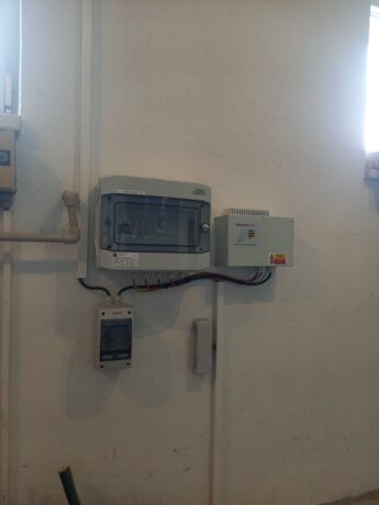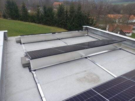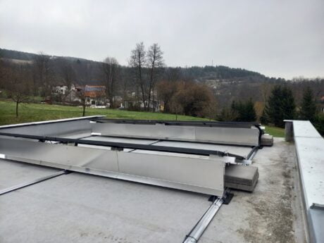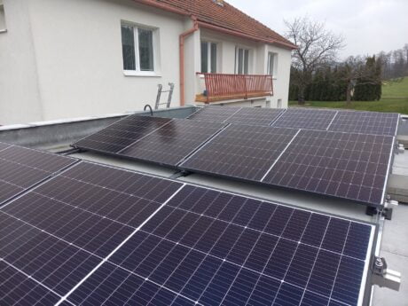 Instalace fotovoltaického ohřevu vody v Horním Poříčí. Na ploché střeše je pomocí samozátěžové konstrukce osazeno 6 panelů Trina Solar Vertex S s výkonem 420Wp. Panely jsou přes DC rozvodnici připojeny k MPPT regulátoru SolarEco OPL 9AC3. Regulátor napájí externí topnou patronu Dražice TJ 6/4″ 2kW, která je osazena v 1 000l AKU nádobě a ohřívá jak užitkovou, tak topnou vodu. Projekt byl realizován s podporou z programu NZÚ.